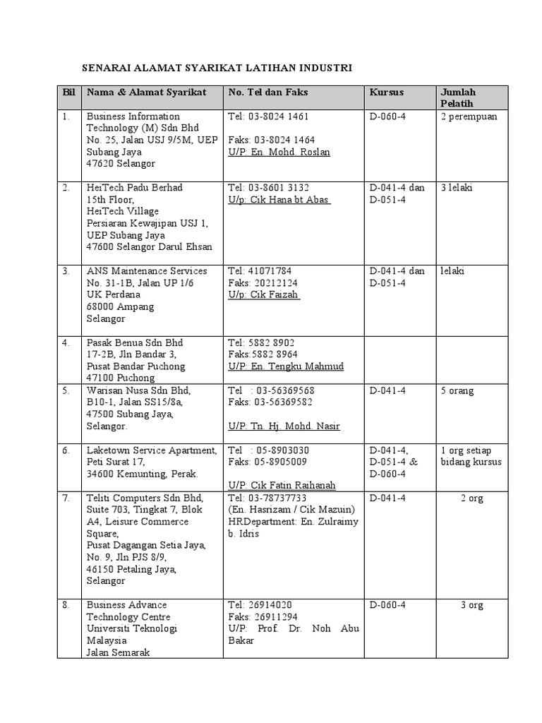 Senarai Alamat Syarikat Latihan Industri Pdf